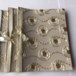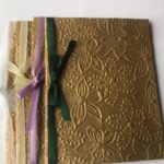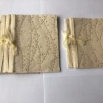 nr. 1-2. Lys Oliven farvet med Guldtegnede blade – Hvide og Lysegrøn Silkebånd. mål: 14,5×14 cm.