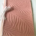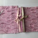 nr. 2. Sandfarvet med Blomster og lidt glitter på blomster – lyserød silkebånd. mål: 13×16 cm.