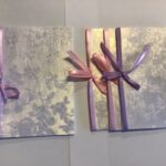 nr. 4-5. Lys Grå med Guld streger – Lysegrøn Silkebånd. mål: 14,5×15 cm.